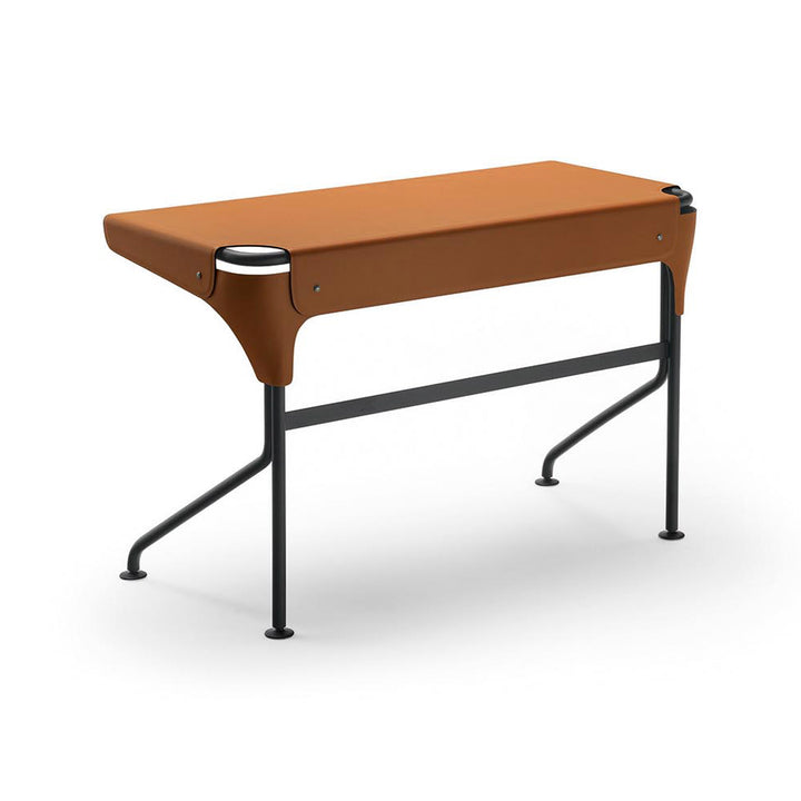 This desk stands out for its meticulous attention to detail, evident in the visible rivets at the angular connections and the innovative leatherwork, where the thickness is gradually reduced to create a subtle depression that runs along the perimeter of the surface.