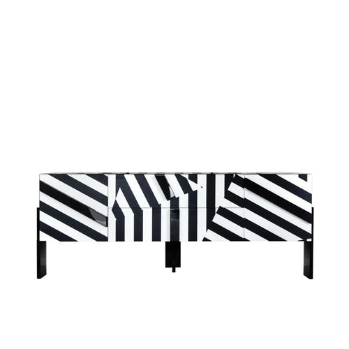 The Ziqqurat Sideboard by Driade, designed by DriadeLab, stands out as a symbol of modern design with its bold patterns and modular functionality. In 2020, Driade, known for its innovative and artistic approach to furniture, expanded the Ziqqurat collection, adding new designs that push the boundaries of aesthetic experimentation. The black and white geometric version with a striking black handle presents a pop-inspired interpretation, making it a standout piece in any interior.