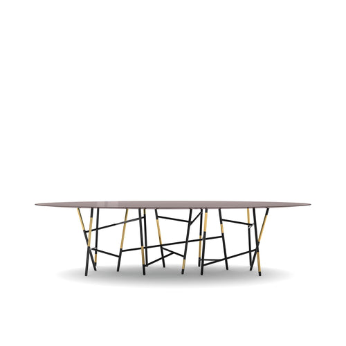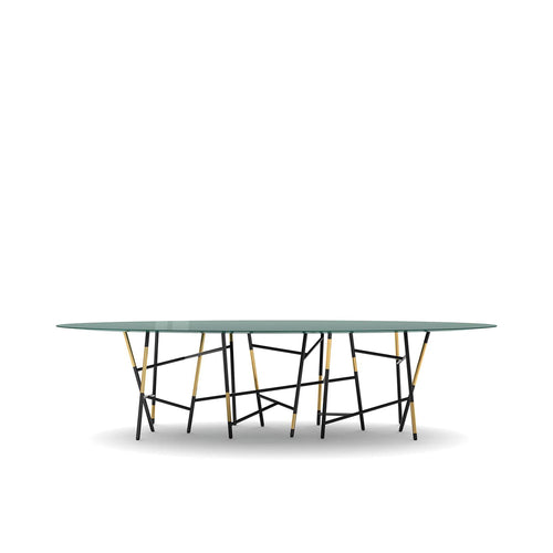 The standout feature of the Millepiedi table is its unique base, composed of thick black metal, brass pipes, and support plates that create a visually dynamic and sculptural effect. This distinctive design makes the Millepiedi a statement piece capable of enhancing both modern and classic interiors with its iconic presence.