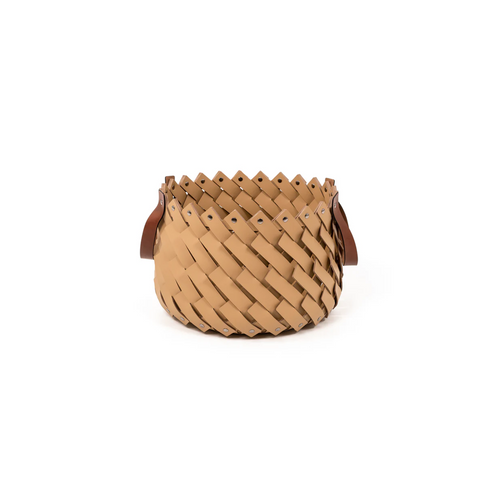 Un cestino versatile ed elegante, impreziosito da pratiche maniglie in cuoio color cuoio naturale, perfetto per contenere riviste, plaid o calzature a seconda delle esigenze.