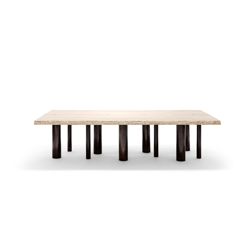 The Joint Stone Dining Table is where bold design meets timeless elegance. The table’s solid travertine top, with its natural edge and intricate stratification, brings an organic touch to any dining space, offering a stunning visual and tactile experience. Supported by sculptural dark stainless steel legs, this piece creates a striking contrast that blends strength with refined sophistication. With its architectural presence and enduring material beauty, the Joint Stone Dining Table is the perfect centerpiece for modern living, making every meal a statement of style and craftsmanship.