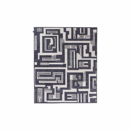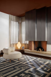 The square geometries of a labyrinth traverse the entire area of the Maze carpets, hand-knotted in wool and inspired by an abstract textile design originating from the archive of the ingenious Italian entrepreneur and designer. There are two color variants: the motif in black on ivory background and in beige on ivory background. In both, accents are entrusted to thin rust-red lines, traced among the meanders of the labyrinth as if drawn with a pen.