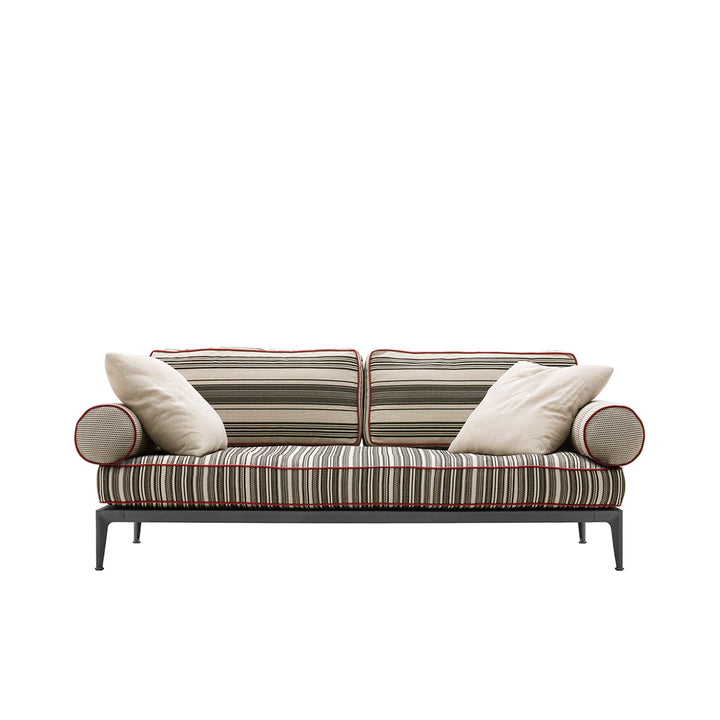 The Ribes Sectional Outdoor Sofa, designed by Antonio Citterio for B&B Italia, is a refined outdoor seating solution combining modularity, comfort, and contemporary elegance. Perfect for any transitional space such as a veranda, shady patio, or covered terrace, this sofa is designed for relaxation and fluid indoor-outdoor living. Its futon base with flexible glass fibre slats, resting on a sturdy aluminium frame, allows customizable configurations, offering unmatched comfort and versatility. Ideal for both casual lounging and formal gatherings.