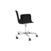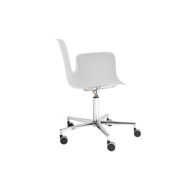 Structure: shell made of fibreglass-reinforced polypropylene in JBI White (RAL 9010). Base: 5 spokes made of die-cast aluminium with plastic casters, swivelling with adjustable height in 412 Polished Aluminum.