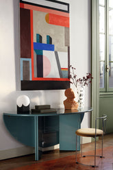 The Cassina Antella Console, designed by Kazuhide Takahama in 1975, is a versatile piece that seamlessly transitions from a sleek console to an elegant oval table. Its polyester-painted frame, available in a gloss or matte finish, pays homage to the traditional art of lacquer work, reflecting the aesthetic depth of the SimonCollezione. The design features two hinged leaves that, when closed, form a compact console secured by a magnet, ideal for positioning against a wall. When space allows, the leaves can be unfolded to create a spacious table, transforming the Antella into a striking centerpiece suitable for dining or display. This dual-purpose design marries practicality with refined style, making it a sophisticated choice for interiors that value adaptability without compromising on elegance.