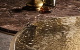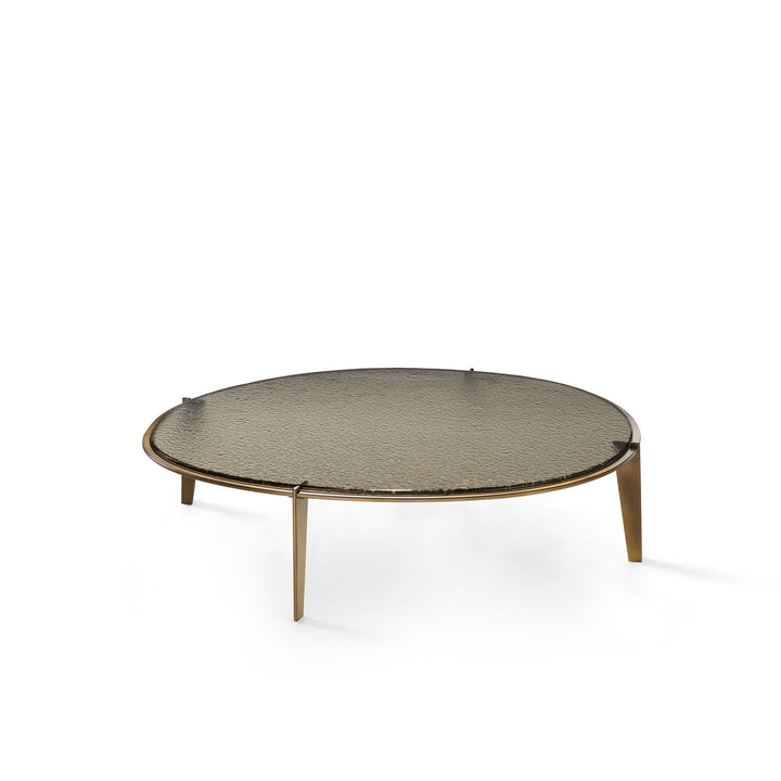 Coffee table with top in 10 mm fused and tempered glass, available in smoked or bronze finishes. Top also available in marble. Metal base in Burnished Brass finish.