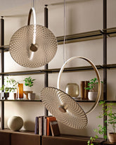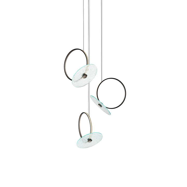 Suspension lamp for indoor use with Mid-Bronze finish aluminum ring structure and opal white plastic diffuser. LED light source integrated within the structure. Decorative diffuser made of 6 mm-thick high-temperature fused glass in extralight, smoked, or bronze finish, available in two texture variants: 'organic' or 'geometric'.