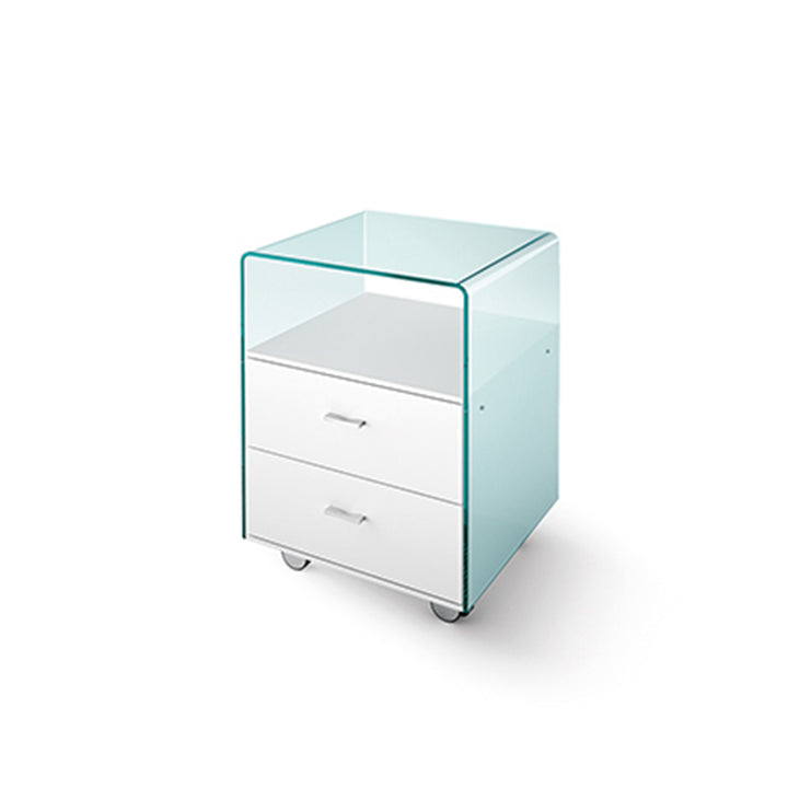 Drawer unit in 8 mm curved transparent glass. The drawers have a white lacquered wood frame. The unit features 2 drawers with an automatic soft closure system, chromed wheels, and handles.