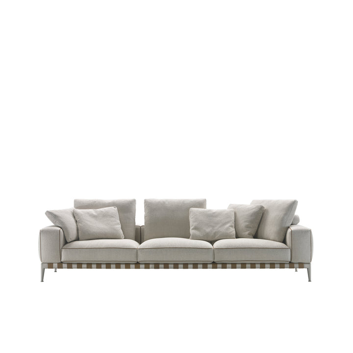 The Gregory Sofa by Flexform, designed by Antonio Citterio, is a striking example of modular seating, offering expansive options for creating generously proportioned arrangements. Its impressive size and flexible configuration make it a perfect centerpiece for any living room, combining comfort and contemporary style. The Gregory seating system is characterized by a metal base that exudes a sense of structured austerity, which is softened by the warm cowhide accents on the exposed sections of the elastic webbing that supports the seat cushions.