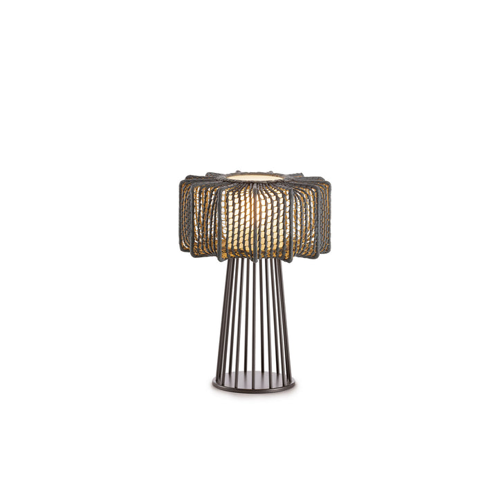 The Flou Arno Table Lamp, designed by Matteo Nunziati, is a masterful combination of modern design and luxurious materials. This distinguished table lamp features an iron structure that is elegantly coated in a matt burnished epoxy powder, providing both durability and a refined aesthetic. The lampshade is uniquely crafted from wave-patterned woven leather, lending a tactile and sophisticated touch to the overall design. The dyed string of the lampshade matches the color of the woven leather, ensuring a seamless and harmonious look.