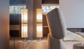 The Flou Grace Floor Lamp, designed by Daniele Lo Scalzo Moscheri, embodies a harmonious blend of design, tradition, and modern textile artistry. This elegant floor lamp features two overlapping cylindrical volumes, each wrapped in a white pleated fabric that exudes sophistication and understated charm. The pleated design creates a subtle vertical motif, lending a refined texture that not only enhances the visual appeal but also diffuses light evenly across the space, resulting in a soft, ambient glow.
