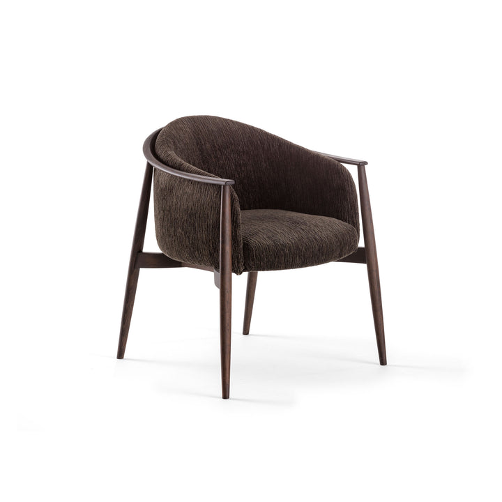 The Flou Tekton Small Armchair, designed by Matteo Nunziati, is a sophisticated piece that blends comfort and refined design seamlessly. Upholstered in rich Bruno 858 fabric, this dining armchair is framed in coffee-brown stained ash, highlighting its warm and inviting character. The organic, fluid lines of the Tekton series ensure that the armchair integrates subtly into a variety of dining settings, adding elegance without overpowering the space. A standout feature of the Tekton Small Armchair is its continuous backrest and armrests, crafted from a single piece of heartwood. This design gracefully extends from the vertical axis of the backrest to meet the horizontal armrests through an innovative spiral component, providing both structural integrity and visual interest. The chair's legs share a truncated oval shape, echoing the design language of the accompanying tables for a cohesive look.