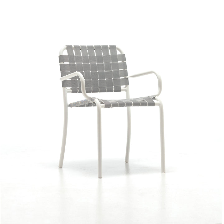 Dining armchair, stackable tubular aluminium frame painted embossed, in the colours pearl, oxido, agate, slate, woven with blue, black, grey or tobacco elastic belts.