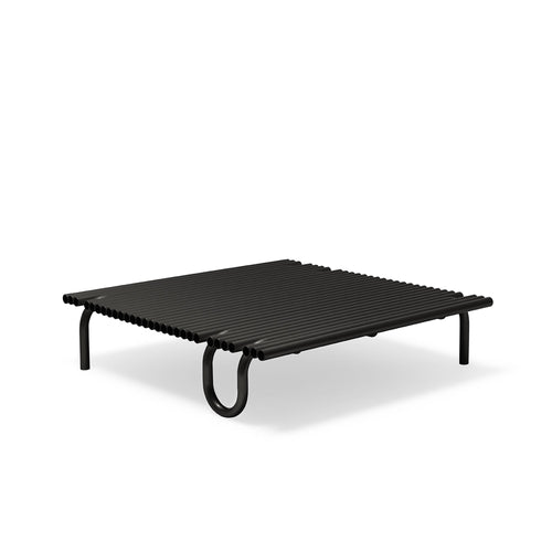 The Pipelines Small Table by Mogg, designed by BCXSY, is a bold metal coffee table that makes a strong graphic statement while maintaining a minimalist design. The table is characterized by essential lines and familiar geometries, creating a sleek, modern aesthetic.