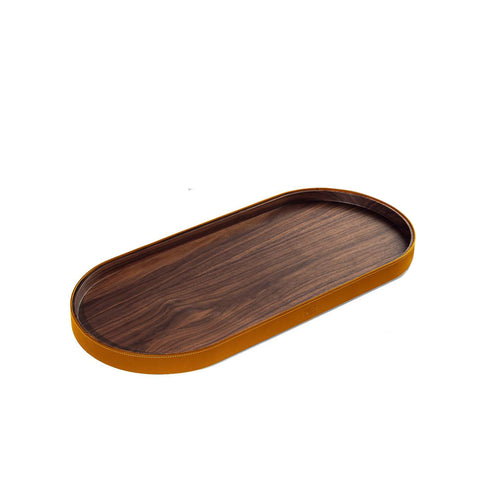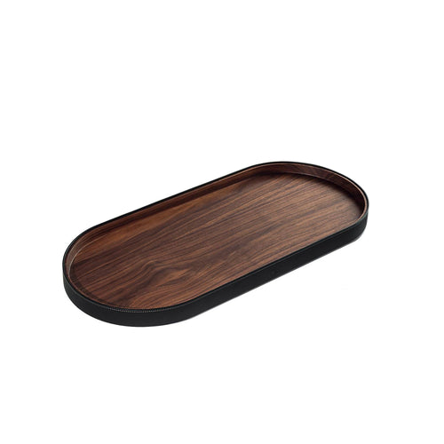 The Poltrona Frau Zhuang Tray, designed by Neri&Hu, is an elegant stackable tray system that combines luxury materials and refined craftsmanship. This large, oval tray is crafted from solid Canaletto walnut wood, hollowed out using CNC technology to achieve a flawless finish. The tray is encircled by a Saddle Extra leather band, which is enhanced by delicate contrast stitching, adding a touch of sophistication. The Poltrona Frau logo is heat-stamped onto the leather, showcasing the brand’s attention to detail and quality.