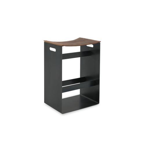 Stool with iron structure with seat upholstered in leather. Available in two different heights.