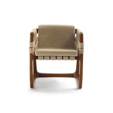 Padded chair with structure in solid wood turned, assembled and sanded completely by hand. An original detail are the strips of leather or fabric running both under the seat, on the backrest and on the armrests. When in fabric these strips have a structural support inside.