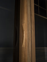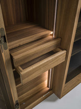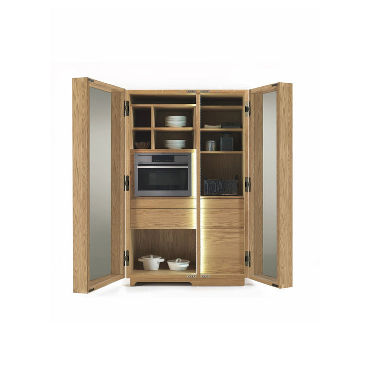 Multifunctional storage unit in blockboard and solid wood, with double glass doors opening to 180°. Designed as a kitchen unit, inside there are containers in various dimensions, with the possibility to insert small electrical appliances (Jumbo version). The inside is illuminated by LED strips along the inner side, activated automatically via sensors when the doors are opened.
