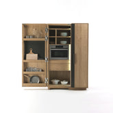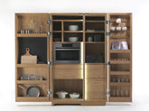 Multifunctional storage unit in blockboard and solid wood, with double doors opening to 180°. Designed as a kitchen unit, inside there are containers in various dimensions, with the possibility to insert small electrical appliances (Jumbo version). The doors’ inner structure allows to organise glasses, dishes and accessories. The inside is illuminated by LED strips along the inner side, activated automatically via sensors when the doors are opened.