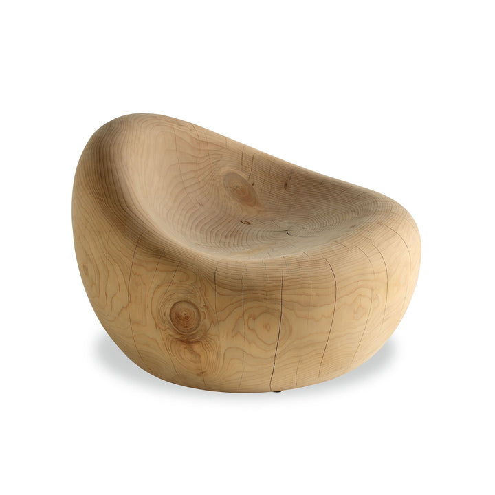 Armchair made from a single block of scented cedar. A sculptured monolith with a curvy and sinuous design. It has an ergonomic seat in a continuous line with the back. Available with or without base with tubular legs and iron plate.