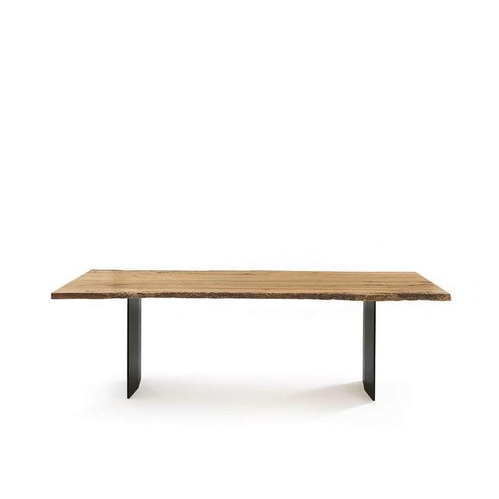 Table with top made of solid Briccola planks, not glued, with natural sides in combination with iron legs characterised by double sheet metal semi-folded in the shape of a rhombus.