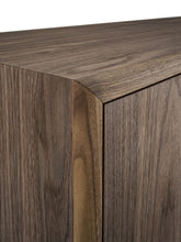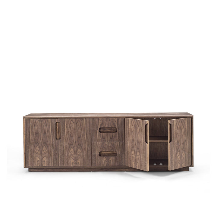 Sideboard in solid wood and blockboard. Equipped with four hinged doors and four drawers with shaped, recessed handles. Drawers assembled with dovetail joints. Structure with rounded edges.