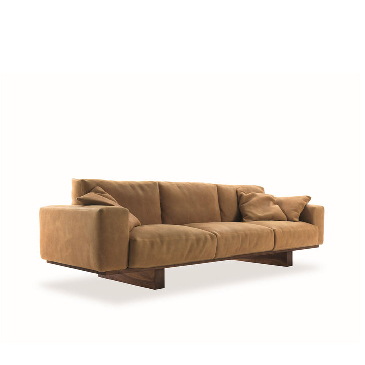 Sofa with backrest, base and feet in veneered blockboard, composed of modular elements. Upholstered with leather or fabric with visible stitching.