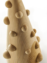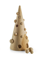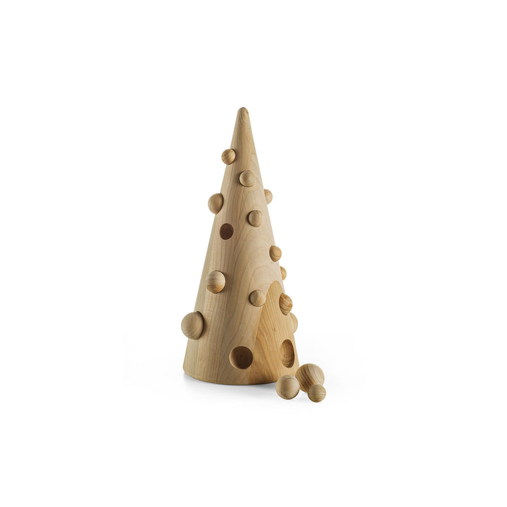 The traditional Christmas tree is interpreted by a conical, simple and linear shape, interrupted by multiple round holes that hold small solid wood spheres, reminiscent of decorative balls.