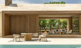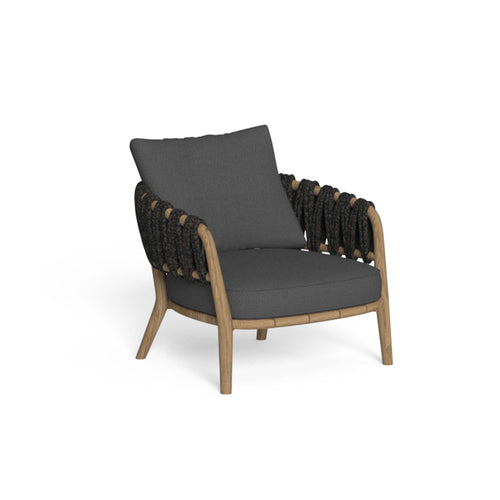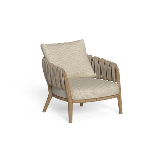 The Venice Lounge Armchair by Talenti, designed by Ludovica and Roberto Palomba, is crafted with a solid teak wood frame, this armchair combines durability with a light, airy aesthetic, paying tribute to Venice’s iconic charm and elegance. The generously padded seat provides ample comfort, while the backrest, adorned with a braided rope in nautical style, embraces the cushions with soft, flowing lines. With fabrics available in enveloping, natural hues, the Venice Lounge Armchair effortlessly integrates into a variety of open-air environments, creating a luxurious yet inviting ambiance for any outdoor space.