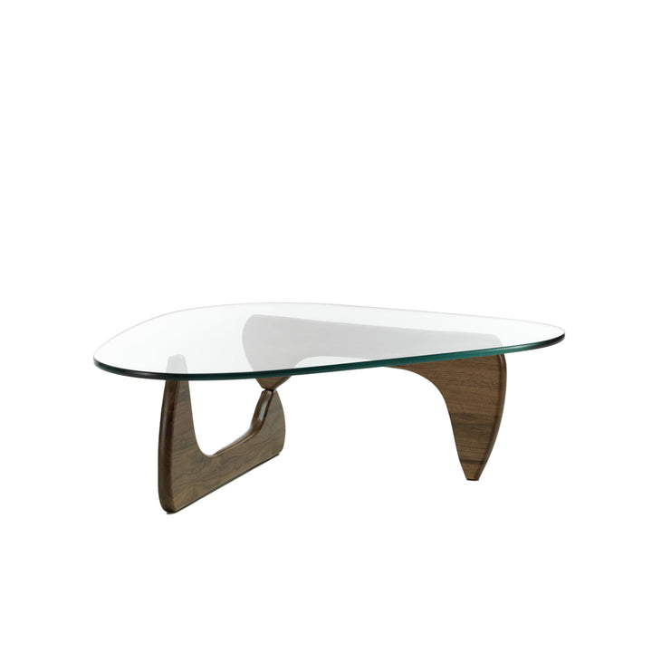In creating his design for the Coffee Table, Isamu Noguchi translated the biomorphic aesthetic of his sculptural works into a piece of furniture with distinctive organic forms. Presumably for this reason, Noguchi regarded the table as his best furniture design. Two wooden leg elements, which are available in black ash, maple or walnut, are positioned at a right angle to provide a stable support for the heavy, sturdy glass top.